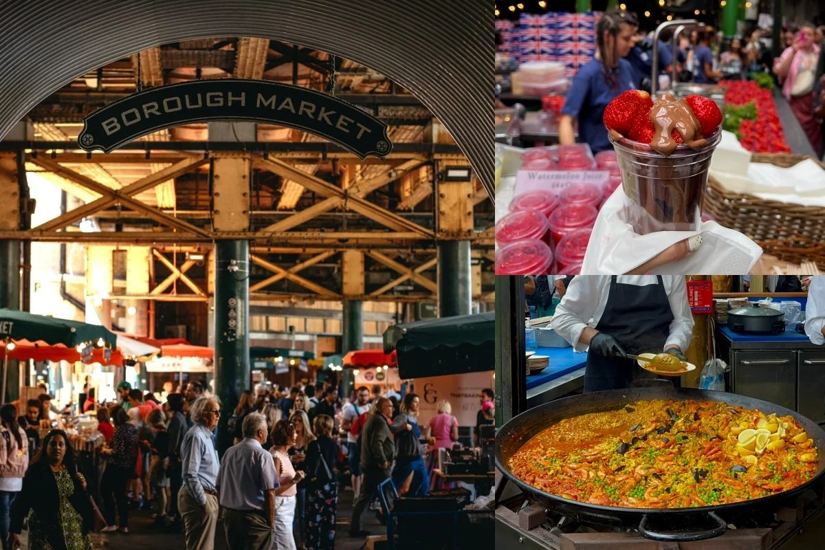 位於 London Bridge 附近的 Borough Market,是倫敦最知名且歷史悠久的美食市集之一,可追溯至 13 世紀。這裡被譽為「倫敦美食天堂」,匯集來自世界各地的特色料理與新鮮食材,是美食愛好者在倫敦旅遊時的必訪景點!經典有名的美食有:草莓巧克力、生蠔、Bomba Paella 西班牙海鮮燉飯、Wild Mushroom Risotto 義大利燉飯、The black Pig 三明治、Bread Ahead Bakery 甜甜圈等,各式各樣的異國料理令人目不暇給。
